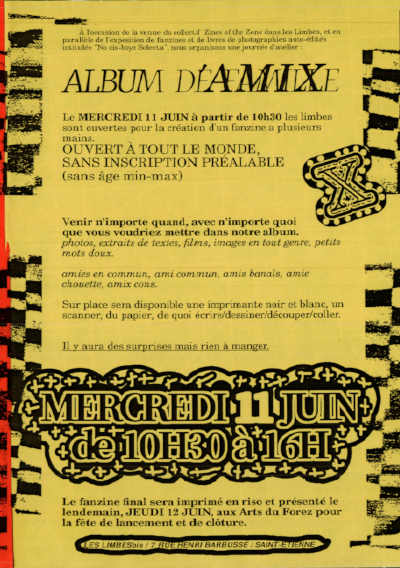 de 10h30 à 16h, atelier fanzine ouvert à toux : "ALBUM DE FAMILLE D'AMIX" venez avec des trucs en rapport avec des ami·e·s, ou non.
